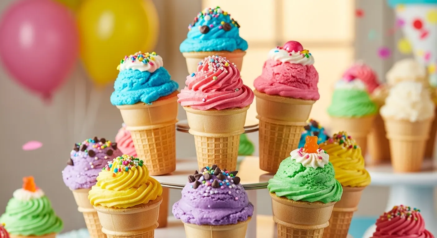아이스크림 콘 컵케이크는 아이스크림처럼 보이지만 실제로는 폭신한 컵케이크가 들어 있는 독특한 디저트예요. 평평한 바닥의 콘에 반죽을 넣어 구워내고, 달콤한 버터크림을 아이스크림처럼 소용돌이 모양으로 올려 완성해요. 파티나 어린이 생일잔치에서 인기 만점이에요.