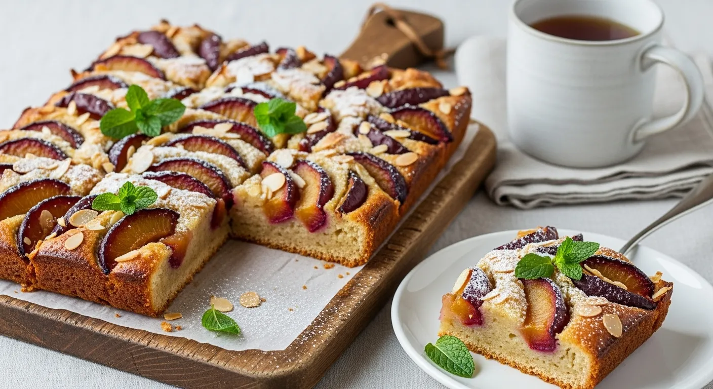 자두 아몬드 트레이베이크는 고소한 아몬드와 달콤한 자두를 한 판 가득 구워내는 영국풍 베이킹이에요. 촉촉한 버터 케이크 베이스에 상큼한 자두가 박혀 있고, 구워진 아몬드 플레이크가 고소함을 더해요. 따뜻하게 먹으면 푸딩처럼 부드럽고, 식혀서 먹으면 티타임 케이크로도 훌륭하죠.