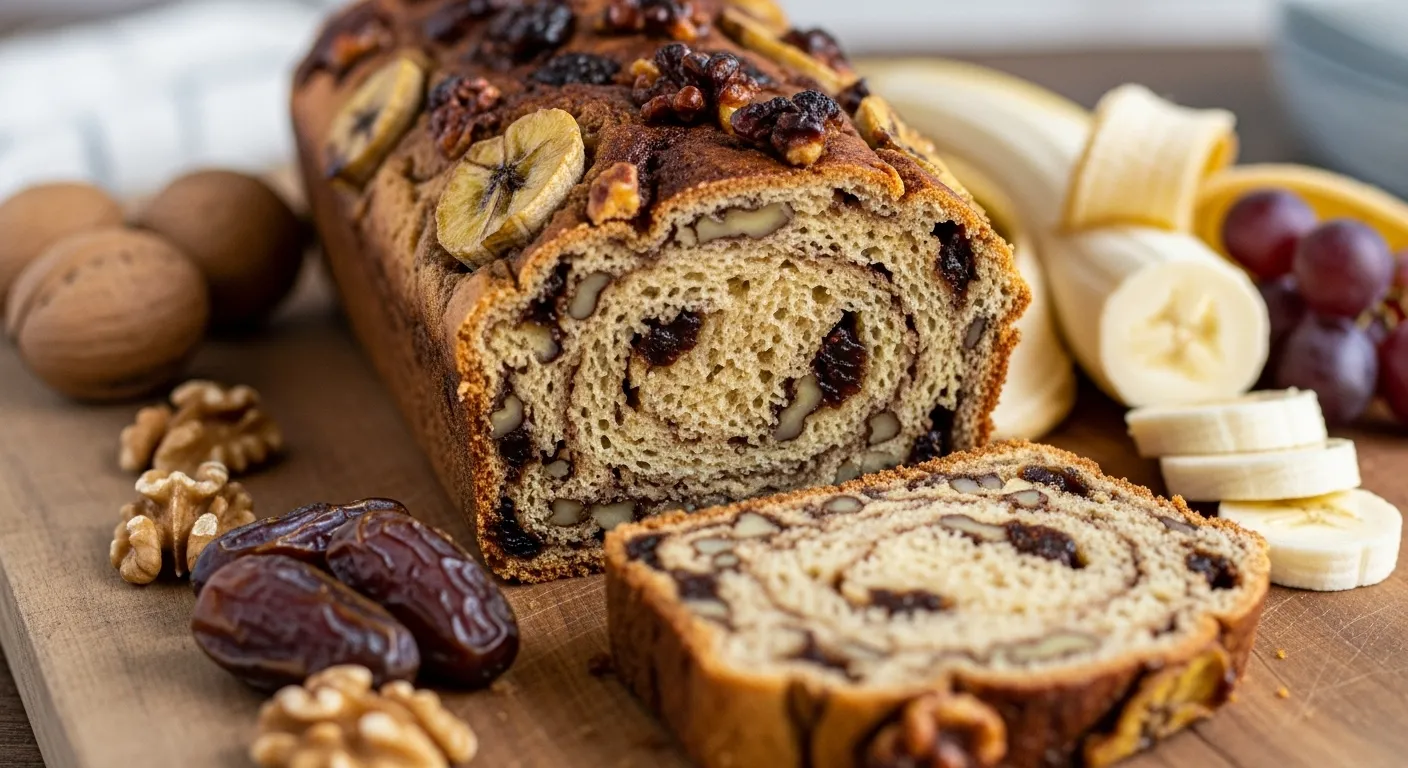 갓 구워진 롤프 위에는 바나나 슬라이스가 장식되어 있고, 속을 자르면 호두와 대추가 골고루 박혀 있어 보기에도 먹음직스러워요.