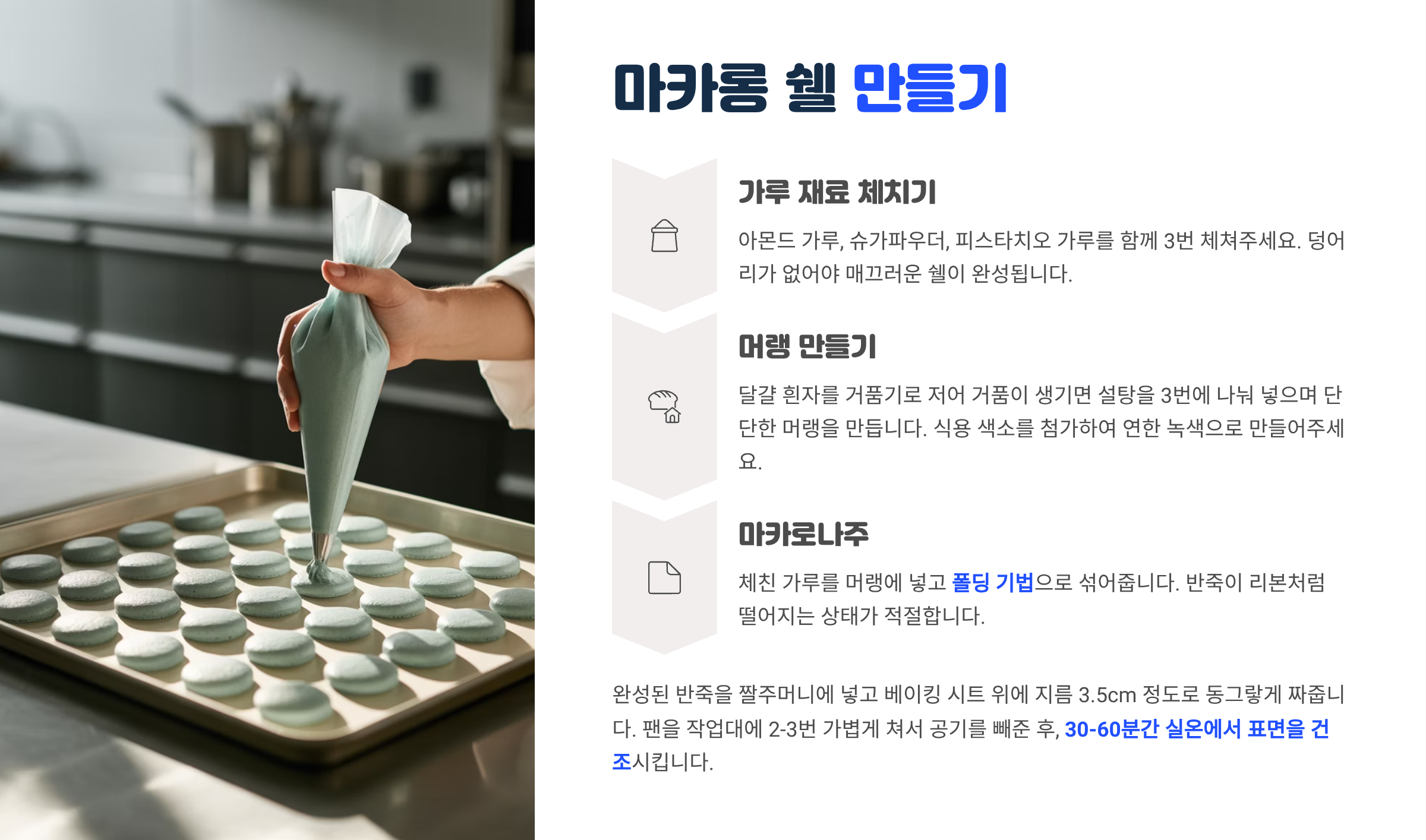 짜주머니에 담아 팬 위에 동그랗게 짜고, 상온에서 30~40분 건조시켜 표면이 마르면 준비 완료예요.