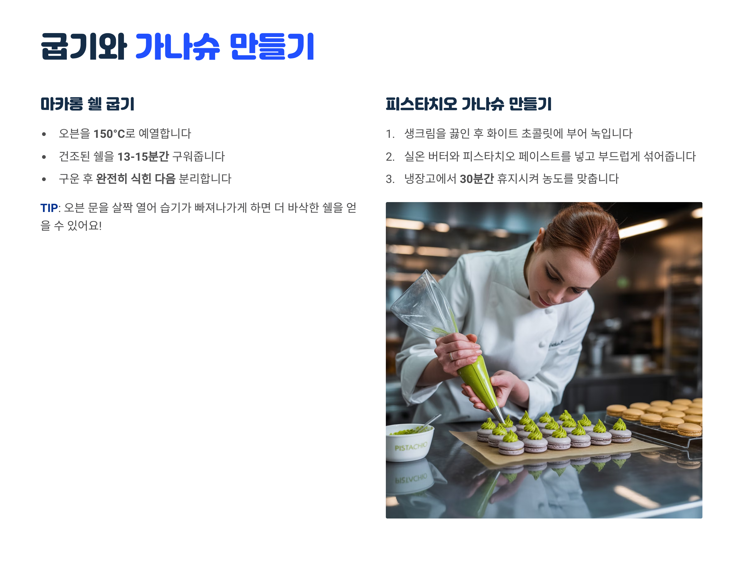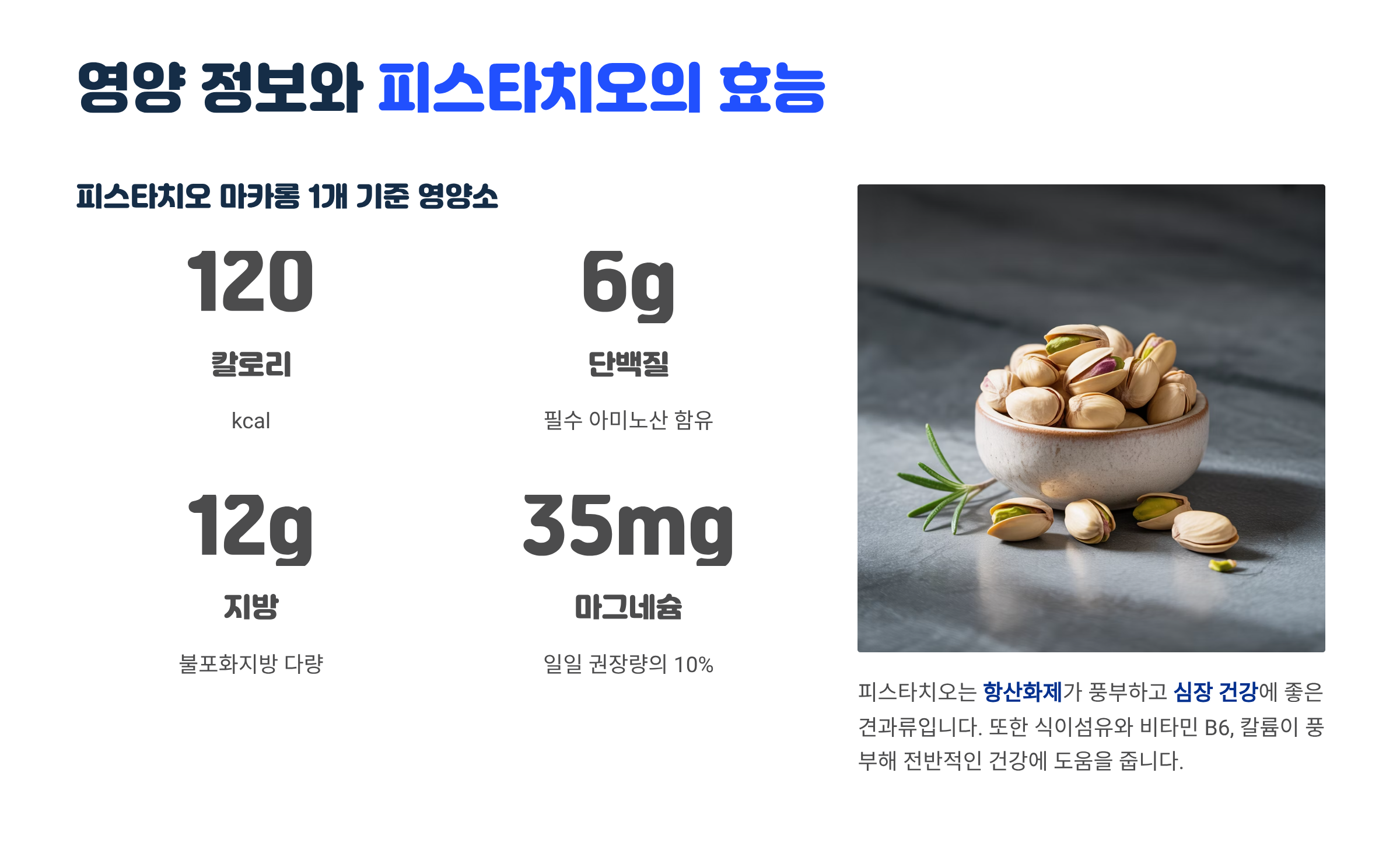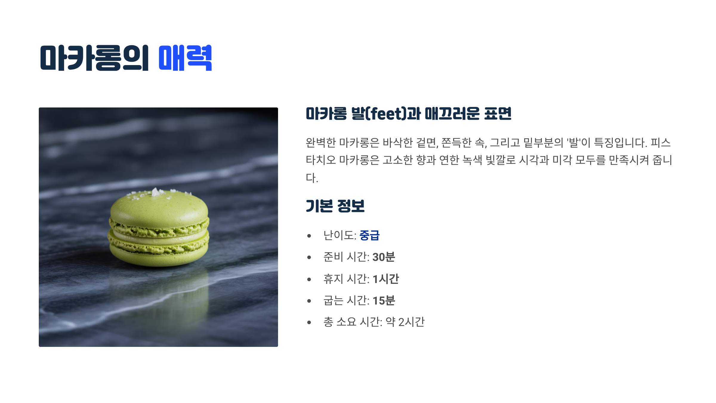 마카롱은 프랑스 파리에서 사랑받는 디저트로, 아몬드 가루와 머랭으로 만든 바삭한 꼬끄 사이에 크리미한 필링을 채워 넣는 고급스러운 과자예요. 특히 피스타치오 마카롱은 은은한 견과 향과 고소함이 매력적이라서, 한 입 베어 물면 입안 가득 퍼지는 부드러운 피스타치오 가나슈의 풍미가 환상적이에요.