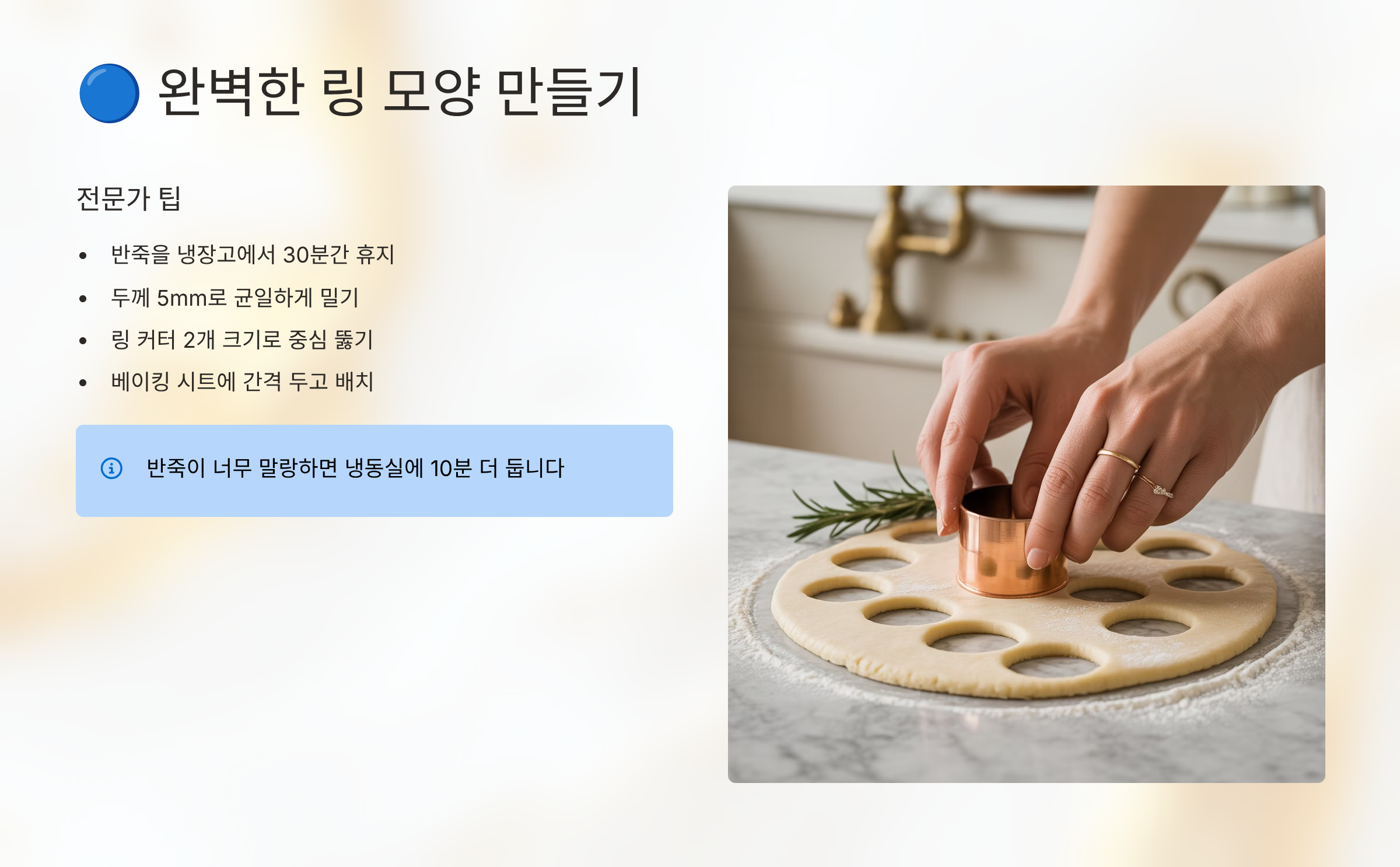링 모양을 만드는 방법은 두 가지가 있어요. 첫 번째는 큰 원형 쿠키 커터로 원을 만든 후 작은 원형 커터로 가운데를 뚫는 방법이에요. 큰 커터는 지름 7-8cm, 작은 커터는 지름 2-3cm 정도가 적당해요. 두 번째 방법은 반죽을 길게 늘려서 굵기 1cm 정도의 로프 모양으로 만든 후 양 끝을 연결해서 링을 만드는 거예요. 이 방법은 더 수제적인 느낌을 줄 수 있어요.