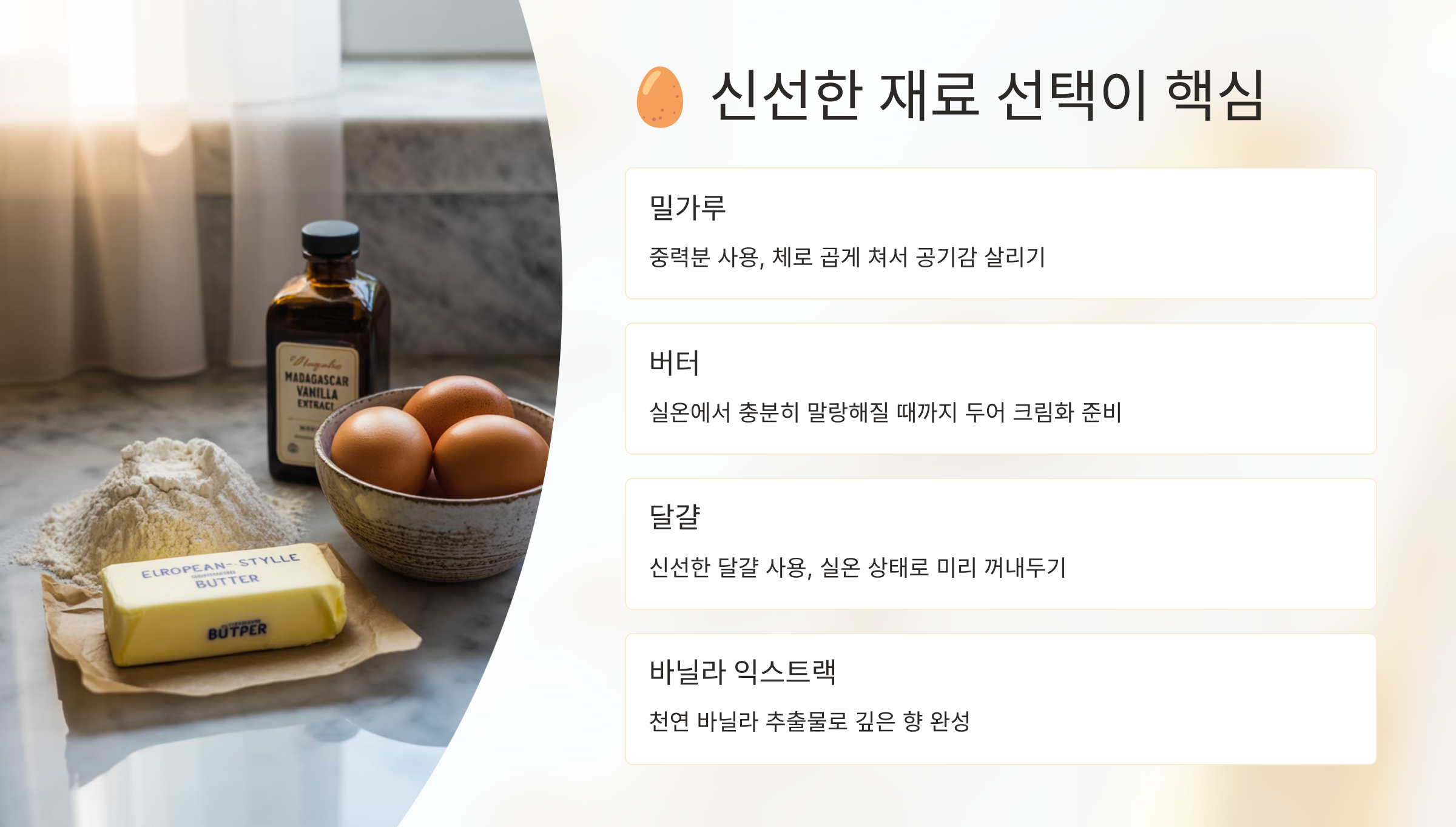 완벽한 링 비스킷을 만들기 위해서는 재료 선택이 매우 중요해요. 무염 버터 100g은 반드시 실온에서 부드러워진 상태로 사용해야 해요. 너무 차가우면 설탕과 잘 섞이지 않고, 너무 따뜻하면 반죽이 질어져서 모양을 잡기 어려워져요. 좋은 품질의 유럽식 버터를 사용하면 더 풍부한 맛을 낼 수 있어요. 버터는 사용 1-2시간 전에 냉장고에서 꺼내서 손가락으로 눌렀을 때 살짝 들어갈 정도의 부드러움이 이상적이에요.